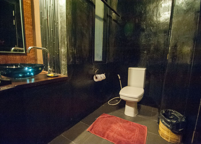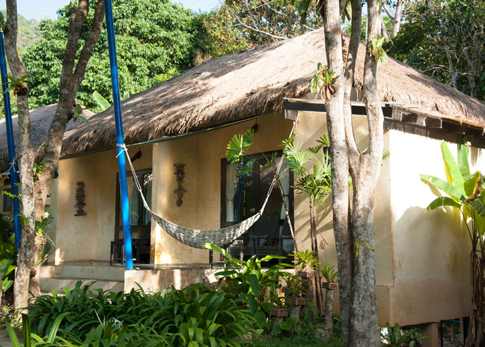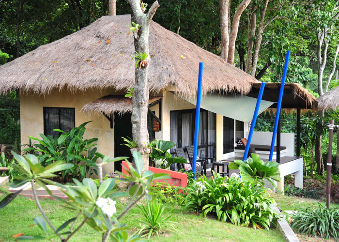 The exterior are designed in harmony with the rainforest by the yellow soft earth tone on the walls and the light brown thatched roofs of the villas. The wooden terraces are sheltered under the brown tent sheets which are in contrast with blue poles to enhance the castaway feel of the resort.