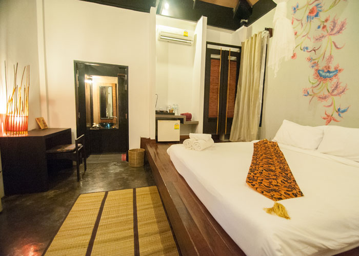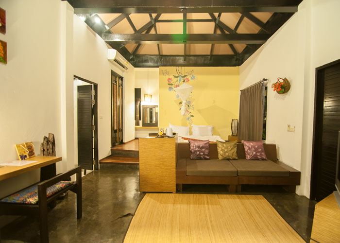Interior is typical Thai wooden bed platform. One signature feature in every villa is the hand painted art on wall facing the front porch which is painted by a renowned artist from Bangkok with different variations in every villa.